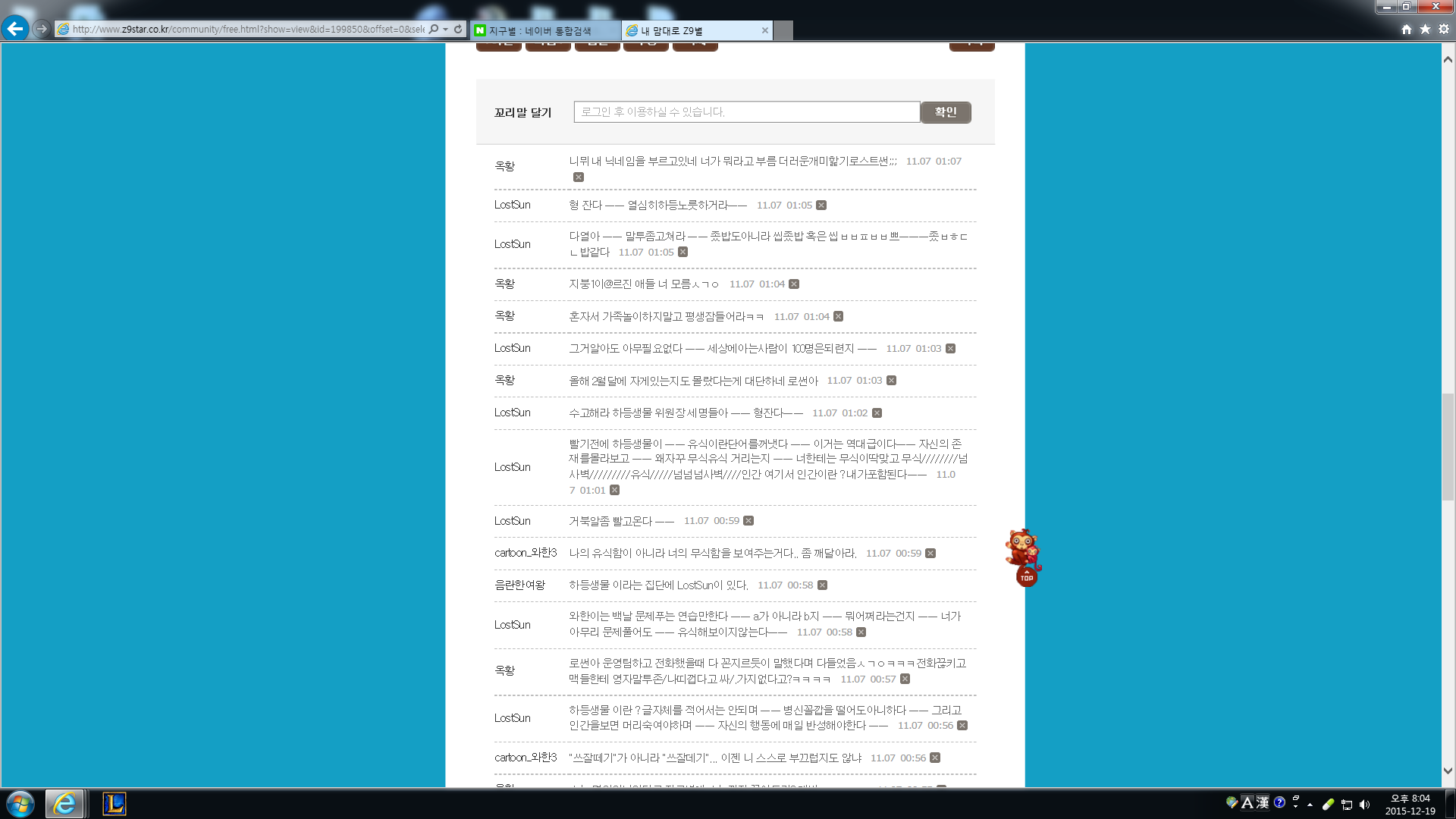 자고로 자게란 저렇게 치고박고 싸워야 자게지 로사자게처럼 1분에 2~3개씩 글올라와서야 되겠냐? 1분에 15개씩은 올라와야 자게란다 지금 보여준 저 자게사진은 지X별 이라는 게임의 자게인데 심심할때 한두번 보면 아~주 재미지더라구.. 참고로 좀 예전꺼긴 한데 저건 아주 약한거에 불과해 원래는 나도 보기 꺼림할정도로 개@같은 패드립을 했었는데 수위상 안올리기로 하고 ㅋ